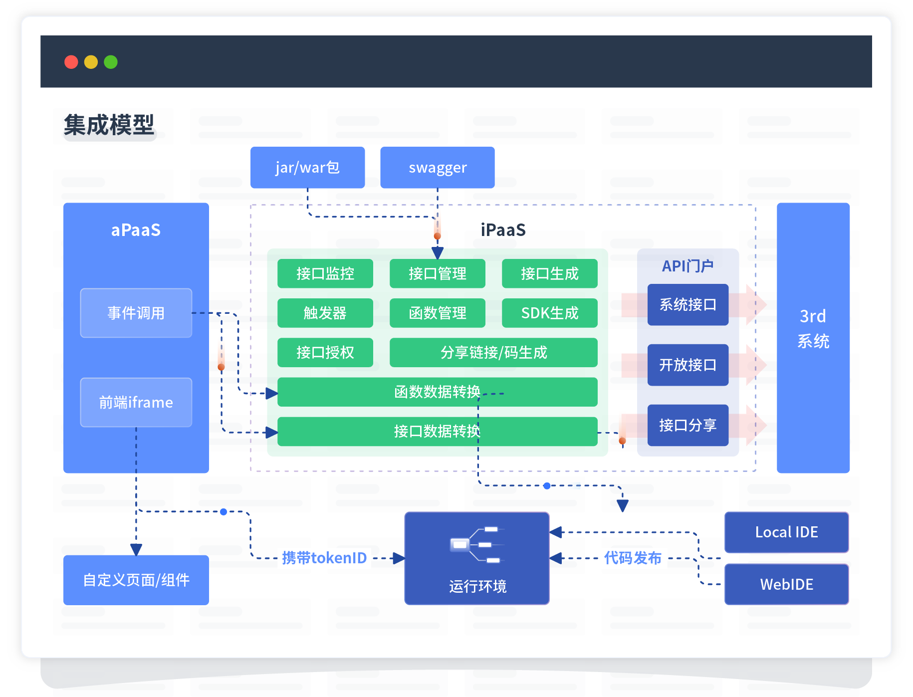 集成模型包括平台本身前、、、后端能力的扩展, ,,也支持通过API门户和第三方系统进行交互。。。