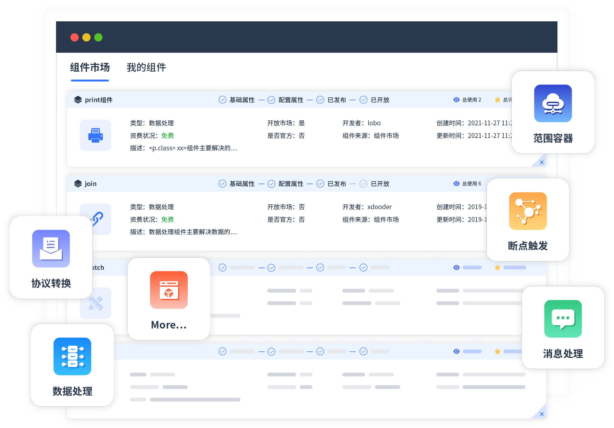 针对集成场景, ,,DDpay钱包提供组件市场, ,,例如协议转换、、、消息处理、、、文件操作等。。。除平台提供的组件外, ,,客户可以自定义所需组件。。。